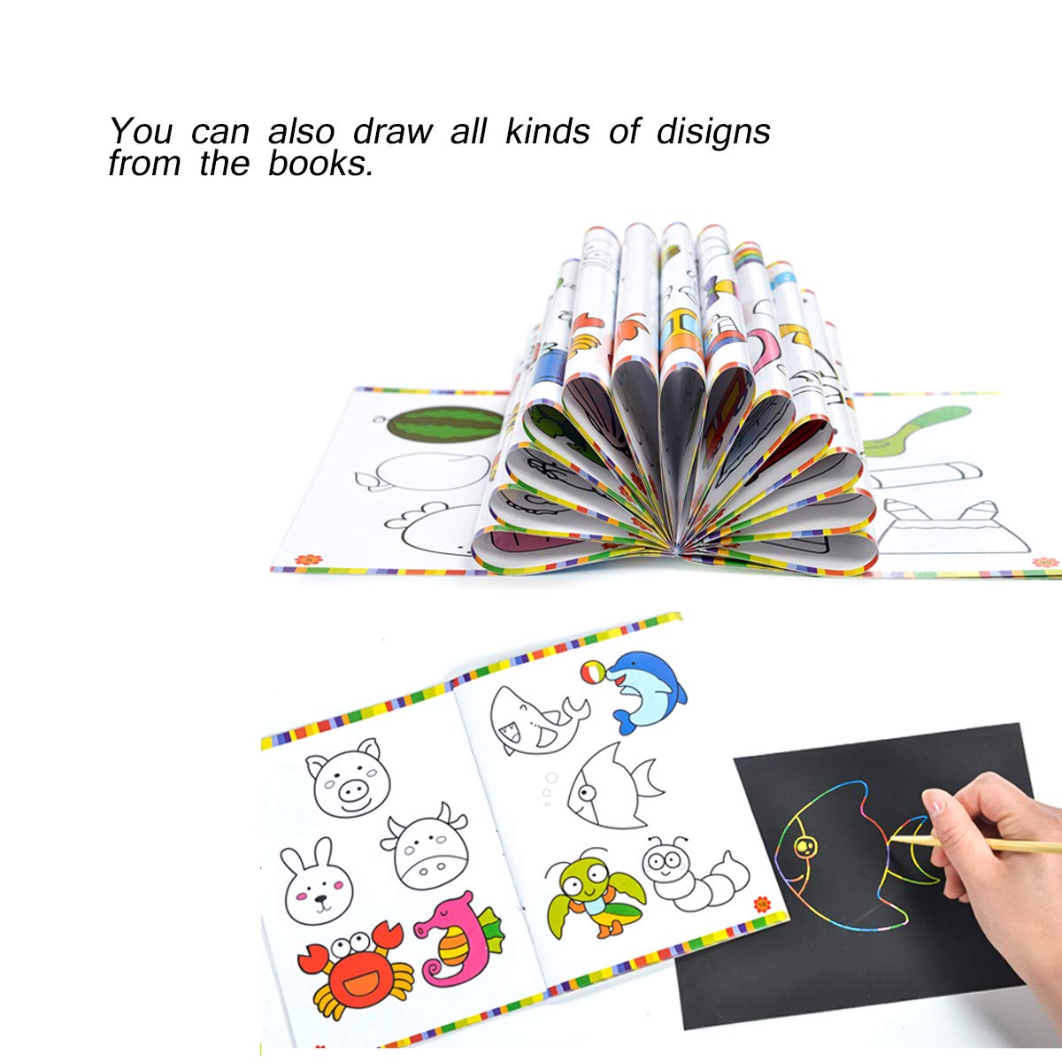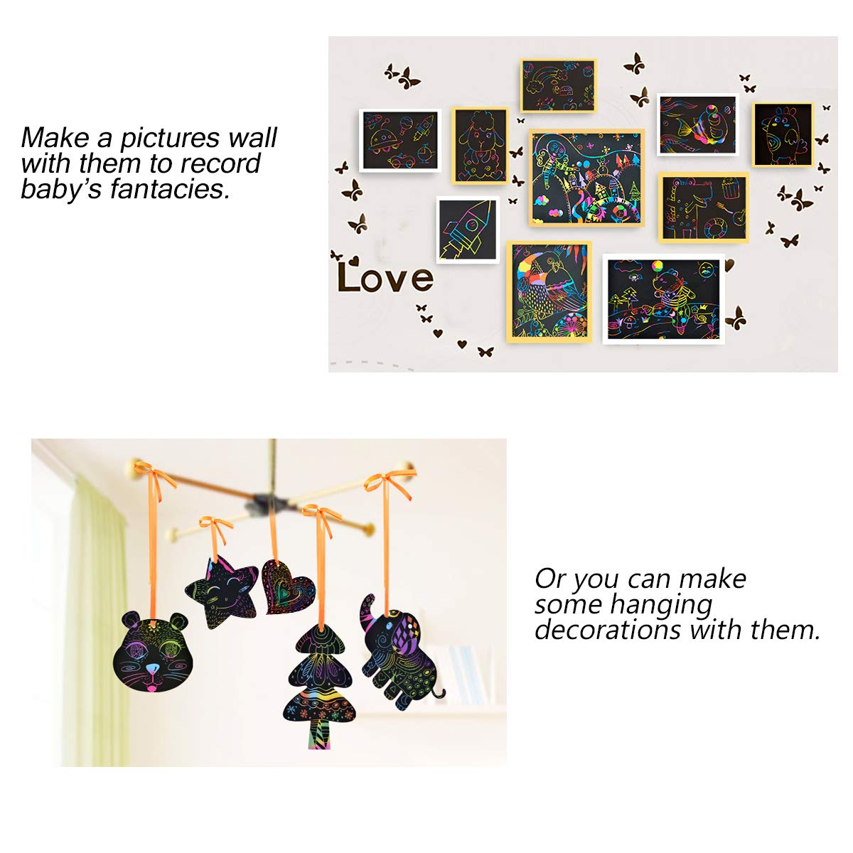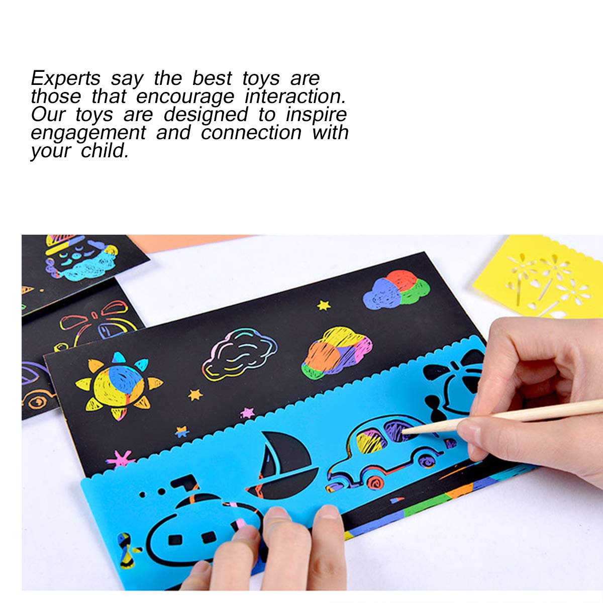 Laissez briller votre occasion créatif: tous les parents souhaitent que à elles enfants aient des mains heureuses! Les enfants peuvent créer des œuvres d’art colorées en enlevant le revêtement noir dans révéler les couleurs de l’arc-en-ciel.